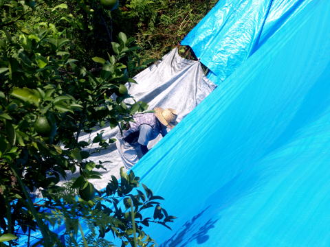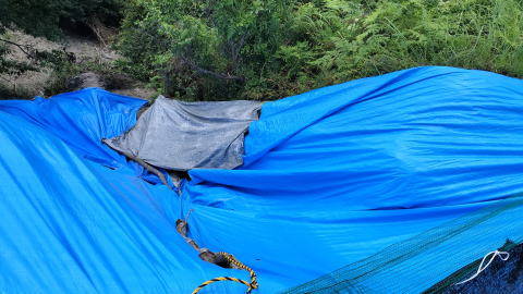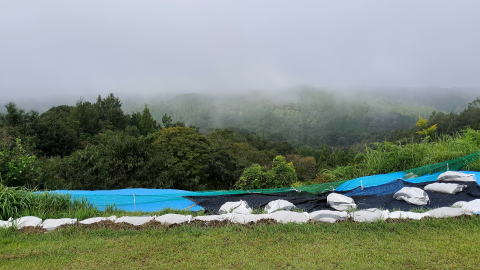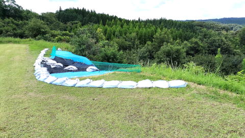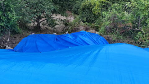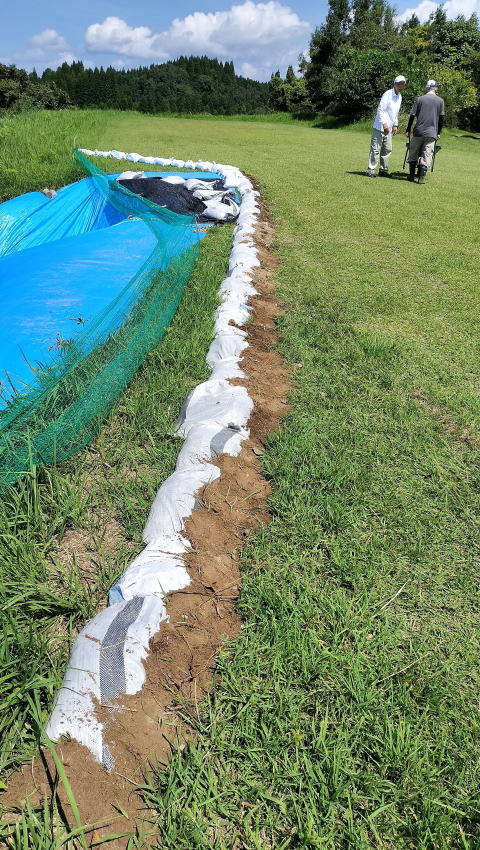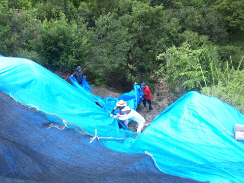 畦用波板と ブルーシートで応急措置 さらにブルーシートの固定とまずはこれ以上流出しないようにする必要があります 本格的な復旧作業は11月? |
